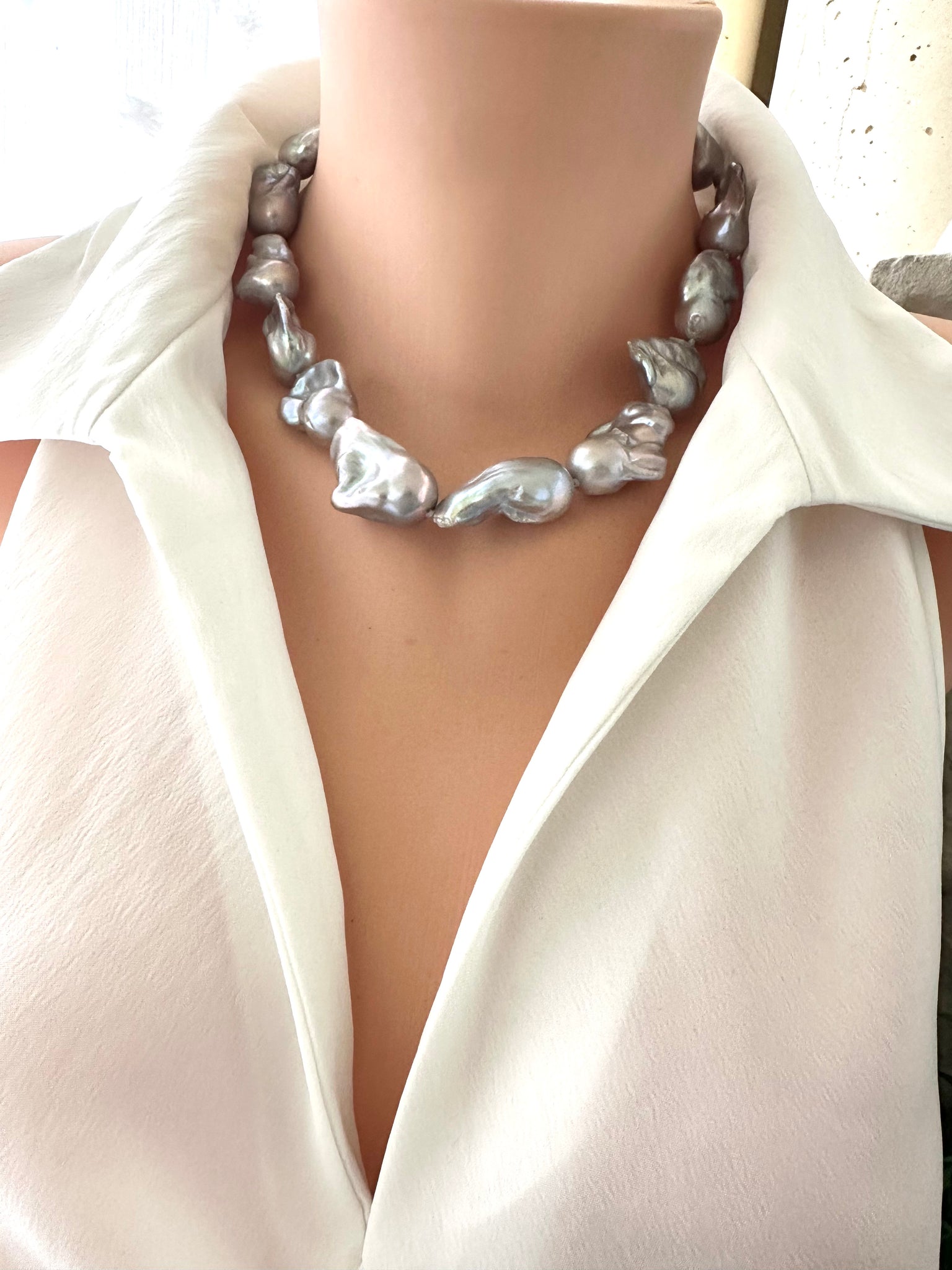 Make a bold and elegant statement with this handcrafted baroque pearl necklace, designed with large silver-grey pearls that glow with natural iridescence. Each baroque pearl features striking undertones of pink, green, and metallic sheen, creating a sophisticated palette that catches the light beautifully. Their organic, sculptural shapes make this piece a true one-of-a-kind treasure.