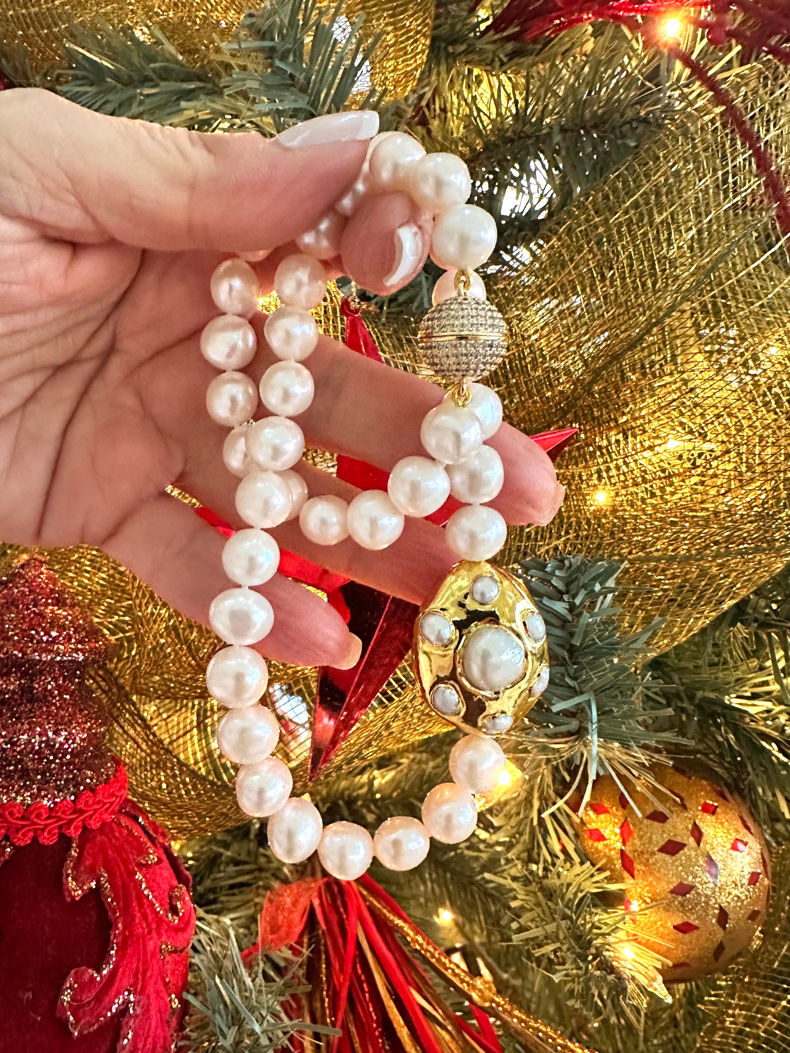 A refined short pearl necklace crafted with hand knotted 9–11mm white potato pearls, accented with a gold plated centerpiece and finished with a sparkling CZ pavé magnetic clasp.