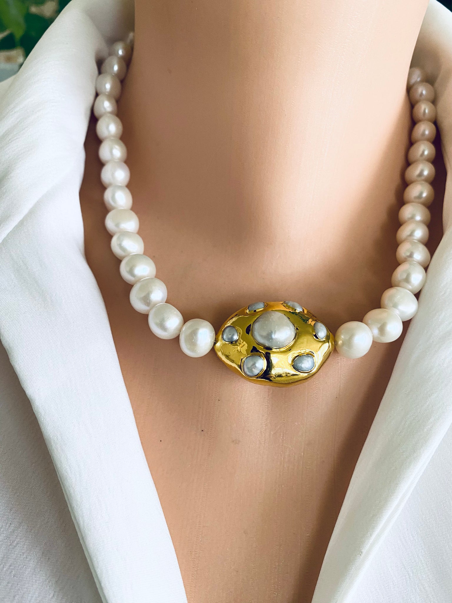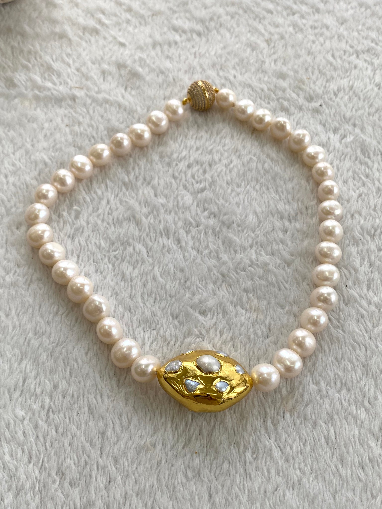 White Potato Pearl Necklace, 9–11mm, Gold Plated Focal Accent, CZ Pavé Magnetic Clasp, 16.5"–18.5"