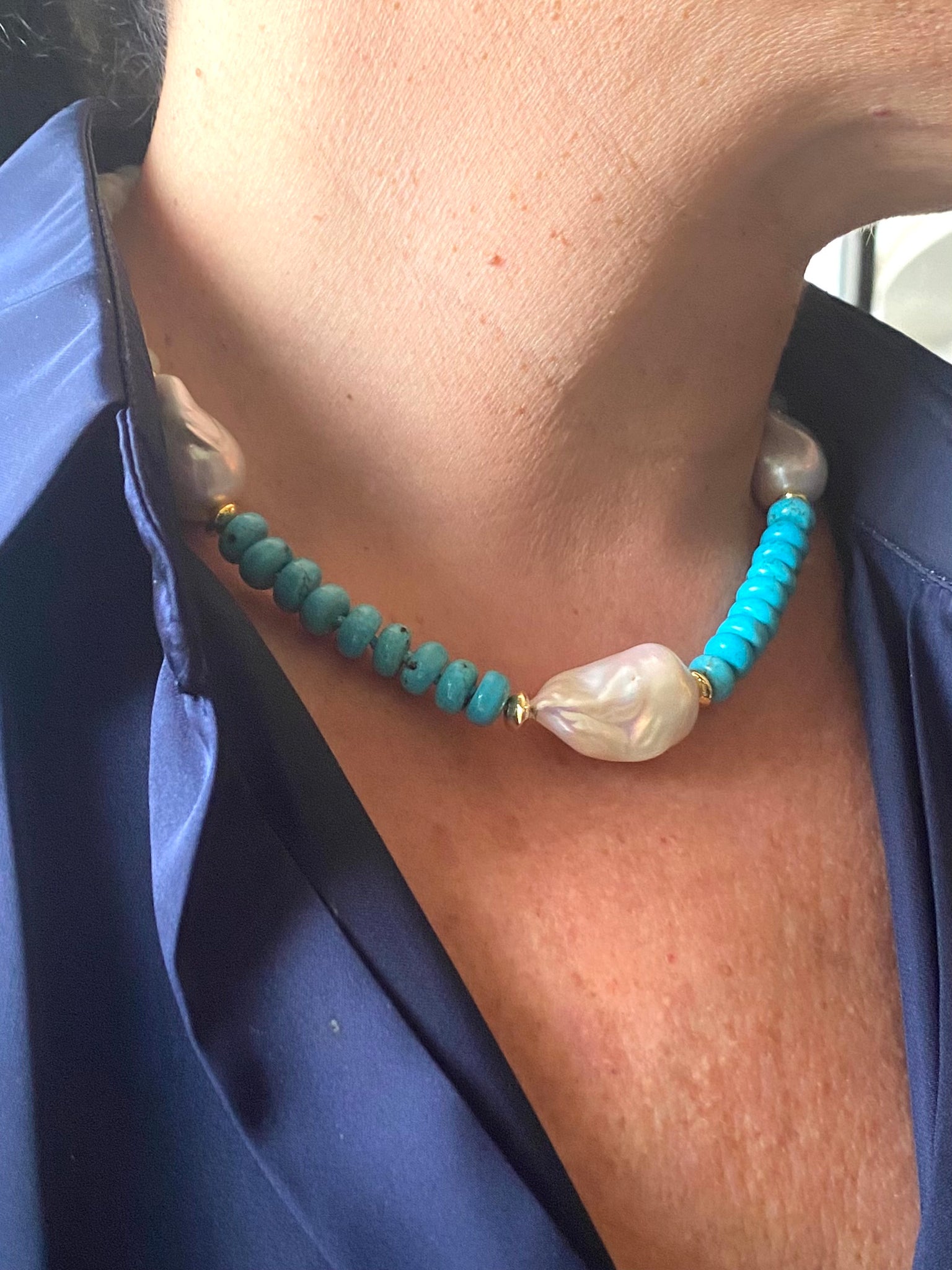Green Jade and Turquoise Pearl Necklace with Baroque Pearls