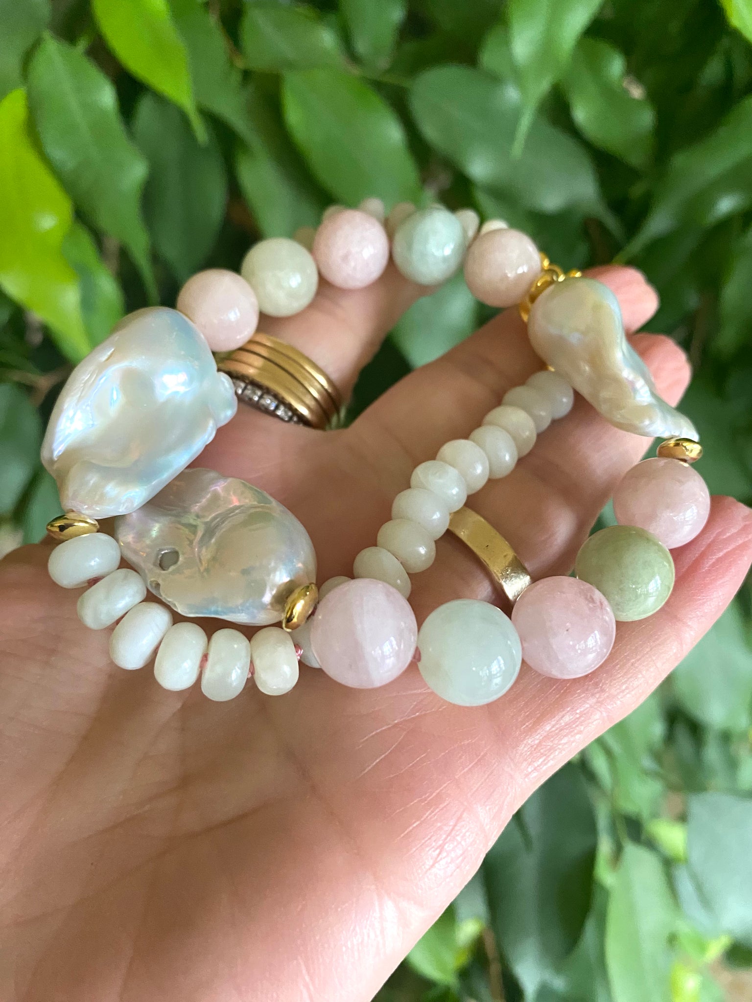 Morganite and Jade Necklace with Baroque Pearls – ‘Alina’