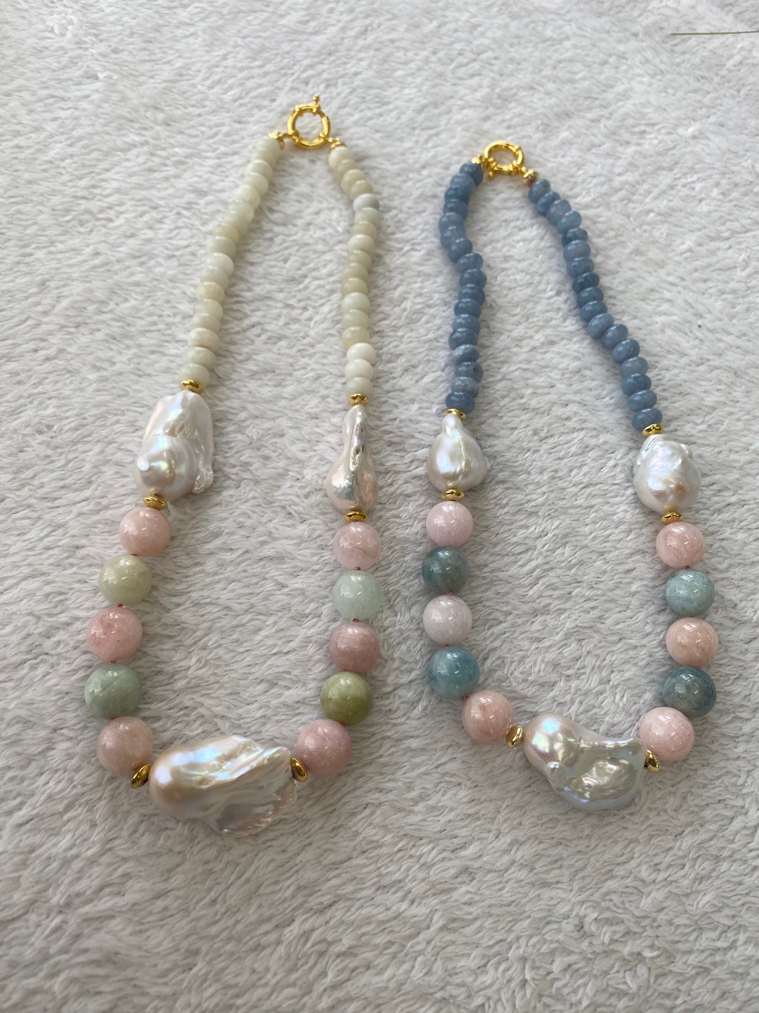 Morganite and jade necklace with baroque pearls beside blue gemstone necklace on white mat, showcasing color contrast and design variety.