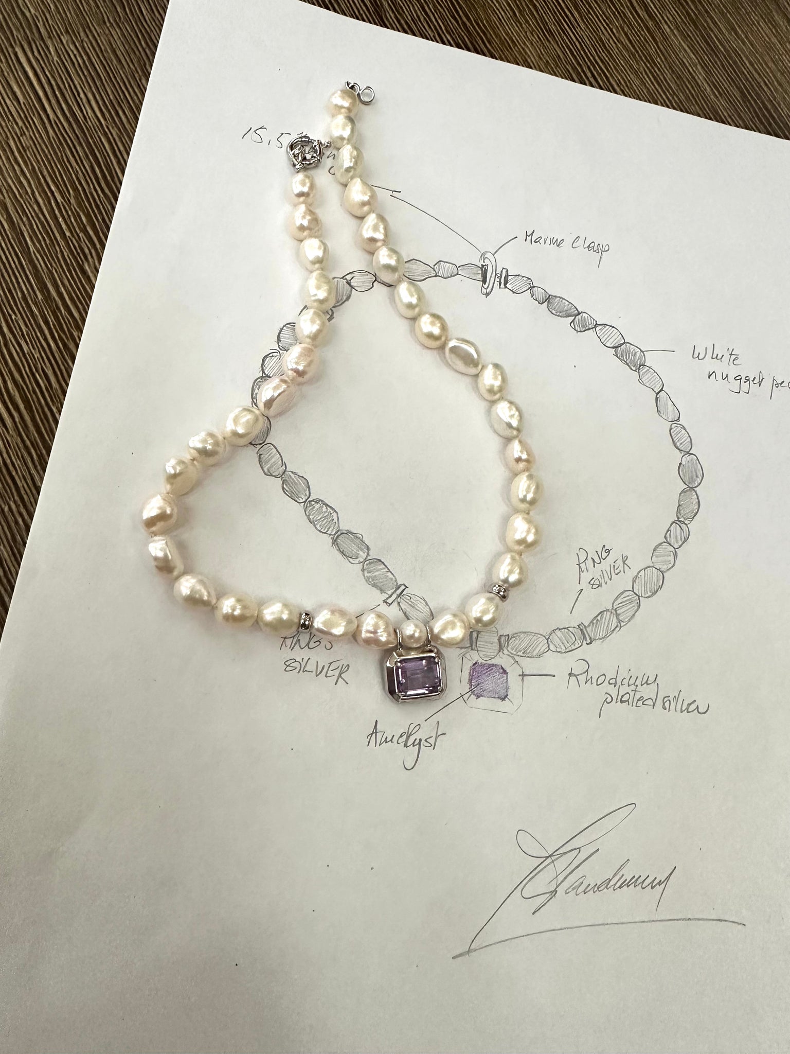 White nugget pearl necklace with amethyst pendant design sketch and necklace laid out on paper.