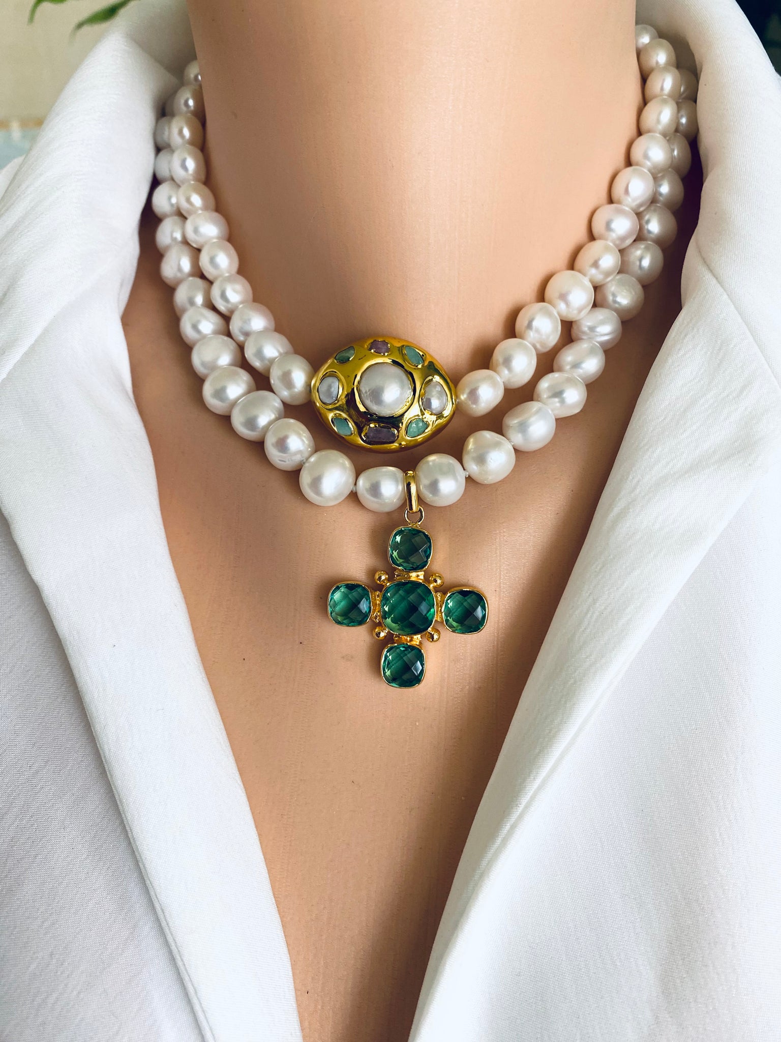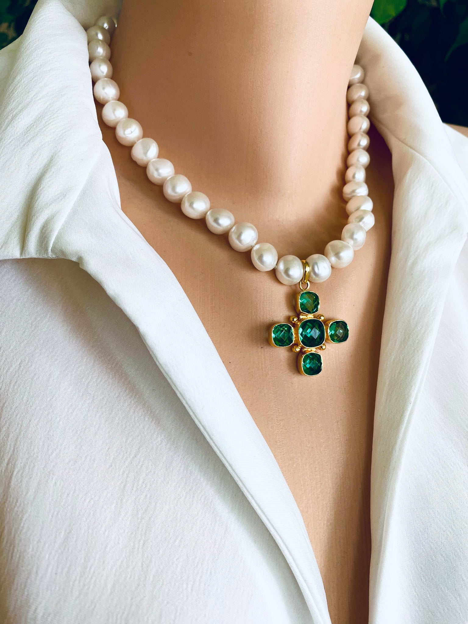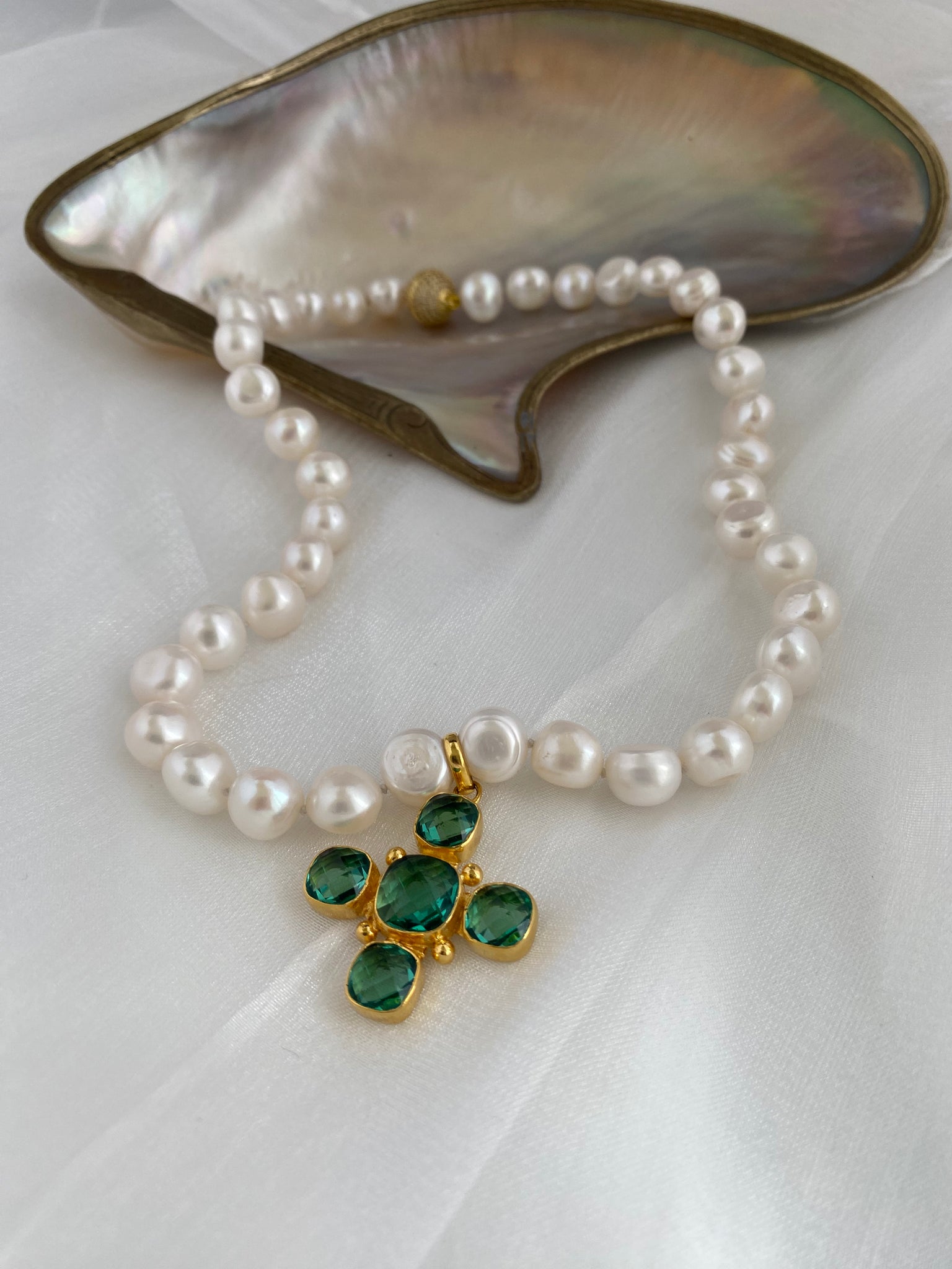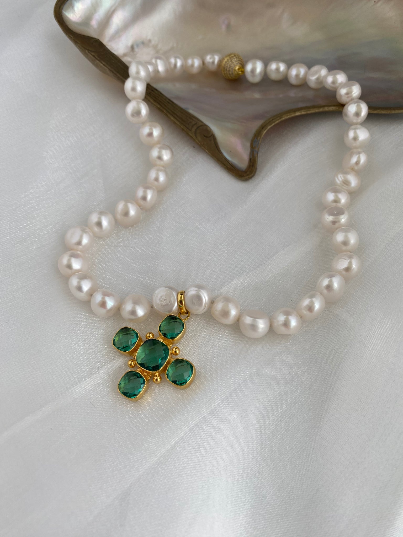 A refined short pearl necklace crafted with hand knotted 9–11mm white potato pearls, accented with a gold plated Green Quartz Cross centrepiece and finished with a sparkling CZ pavé magnetic clasp.