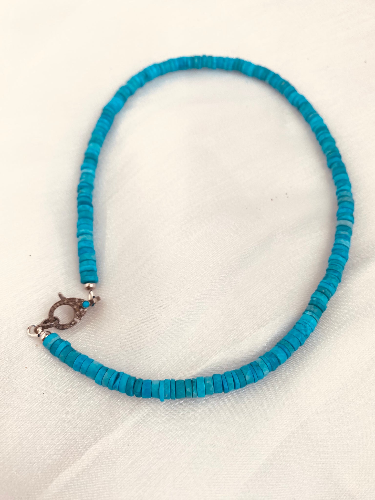 Faceted Turquoise Howlite Necklace, 6mm Heishi Indian Cut Beads, Oxidized Silver Diamond Pavé Clasp with Turquoise, 17.5"