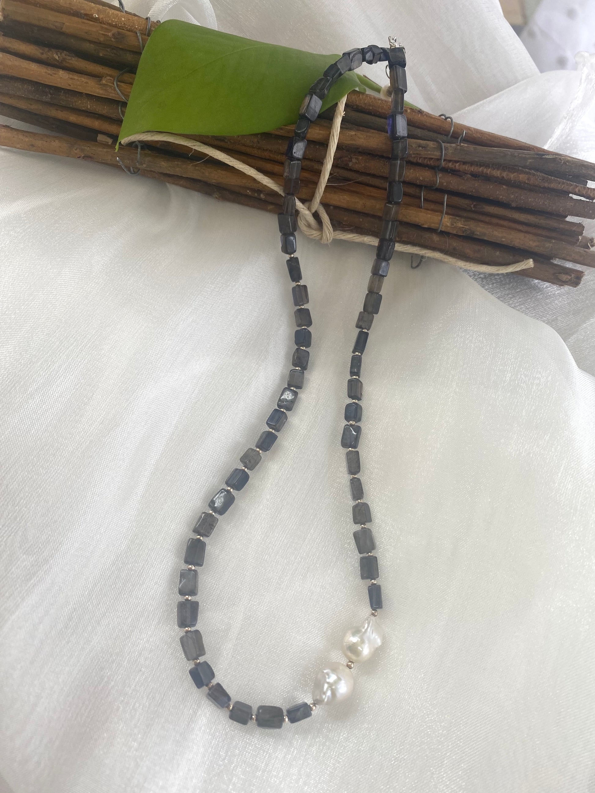 Navy Blue Iolite Beads & Baroque Pearls Necklace
