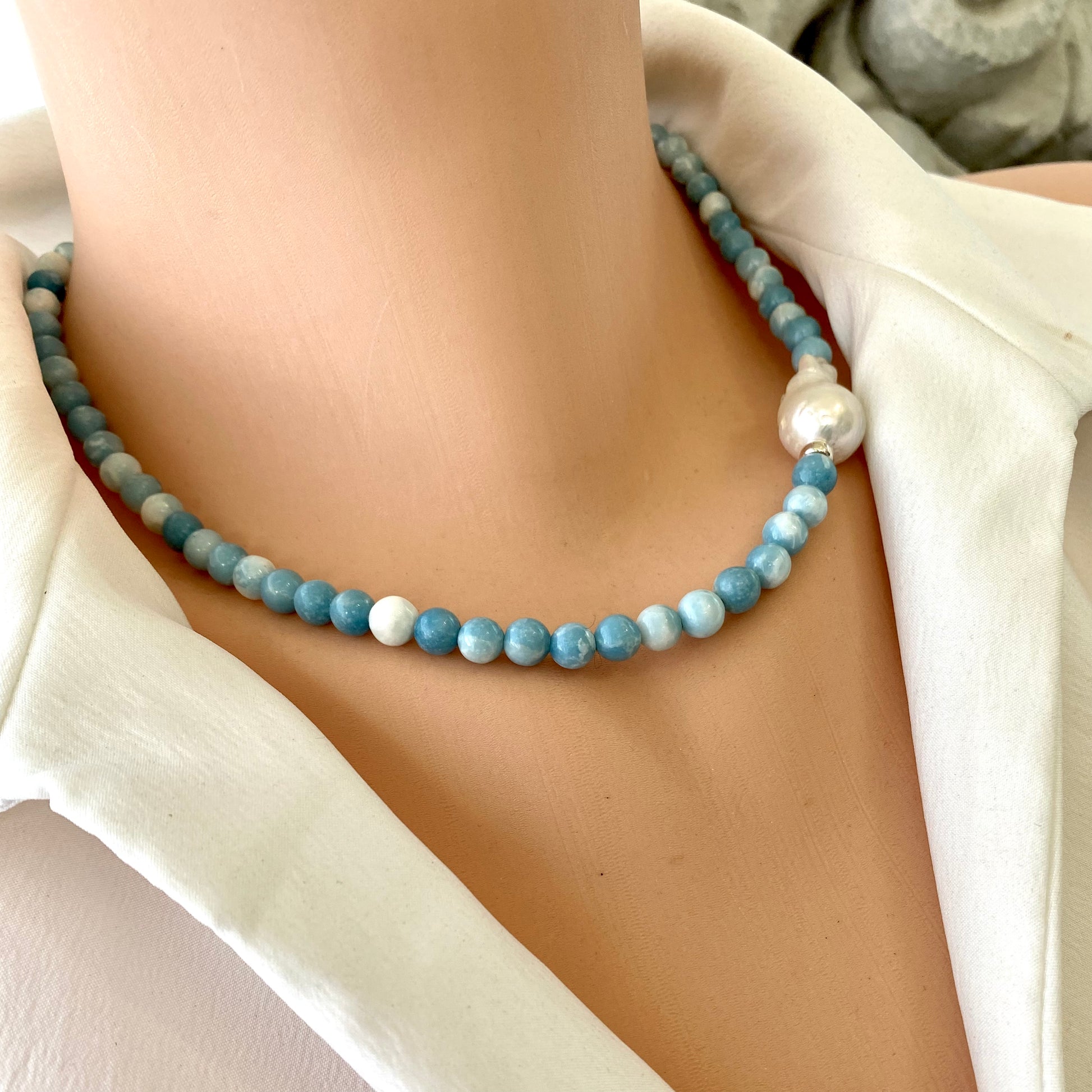 Feel the tranquil Sea and Sky energies while wearing this beautiful Larimar Quartz and baroque pearl beaded necklace.