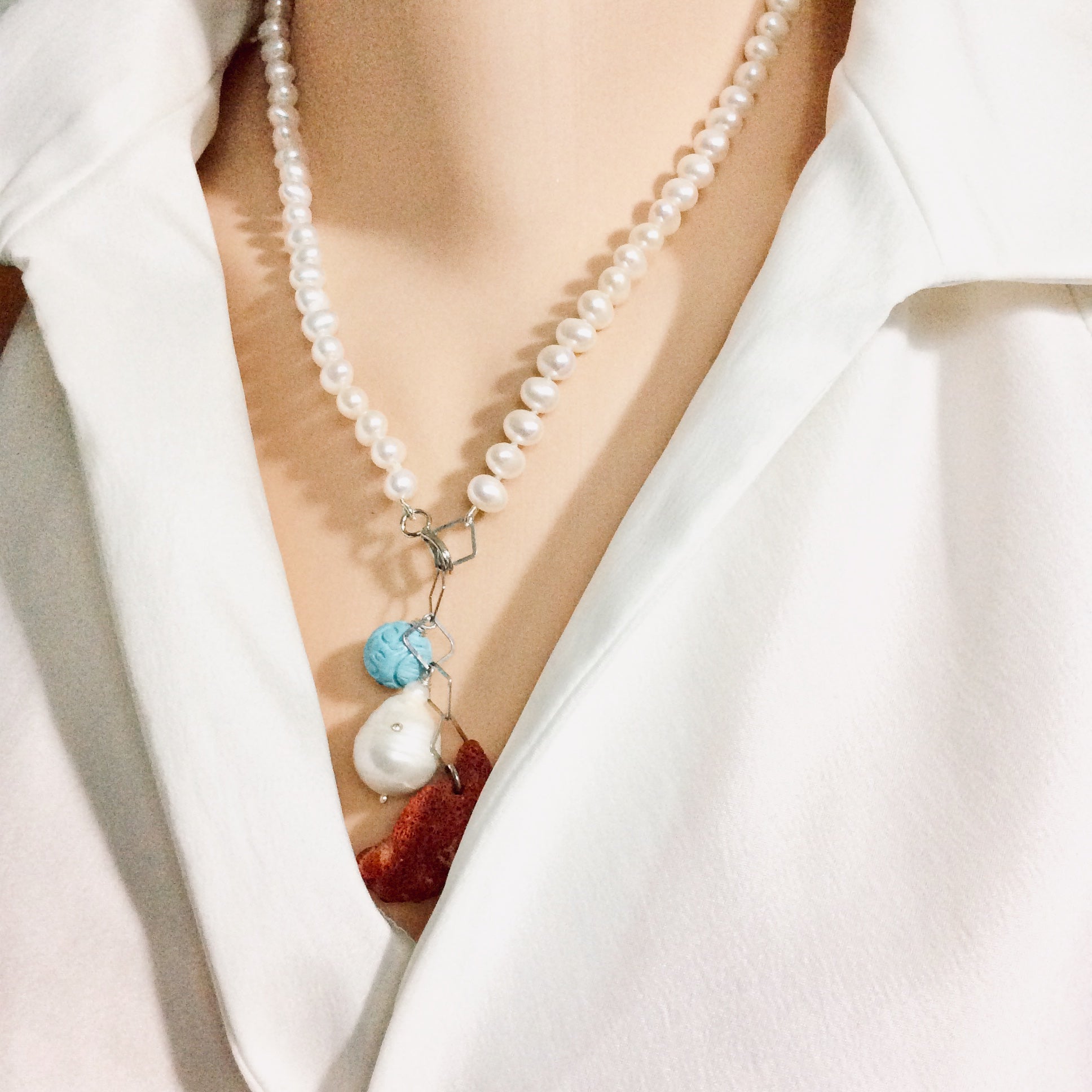 Pearl Necklace with Red Coral Pendant & Turquoise Charm